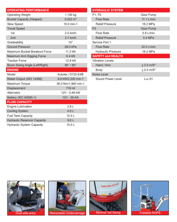 Takeuchi TB210R er designet til at løse de opgaver, hvor pladsen er allermest trang. Med en minimumsbredde på kun 750 mm kan maskinen køre gennem en standard døråbning. Bælterne kan skydes ud til 1020 mm for at sikre stabilitet, når du arbejder.